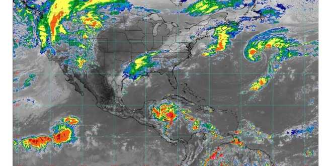 Señaló que sus bandas nubosas ocasionarán nublados y lluvias puntuales muy fuertes durante la tarde-noche de hoy en Quintana Roo, Campeche y Yucatán, así como vientos de 40 a 60 km/h y oleaje de 1 a 2 metros en la costa sur de Quintana Roo.