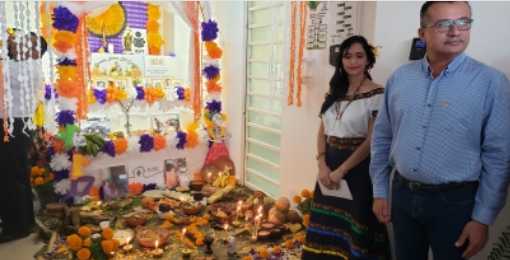 El director general de la dependencia, Raúl Ochoa Bolón y el personal escucharon atentos la explicación acerca del Día de los Fieles Difuntos y de los elementos colocados en el altar.