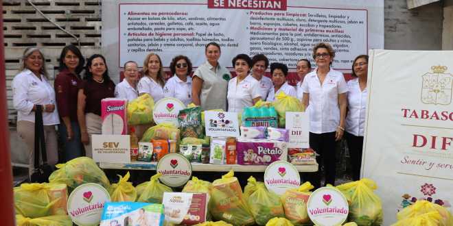 La presidenta del Sistema DIF Tabasco, Guadalupe Castro de Merino, recibió este lunes donaciones de los voluntariados del Tribunal Superior de Justicia (TSJ) y de los Olmecas de Tabasco, que serán enviadas a familias afectadas del estado y de Chiapas, por las intensas lluvias de las últimas semanas.