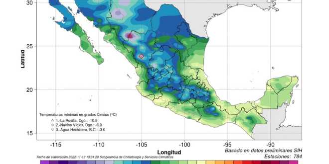 Habrá descenso de temperatura en el oriente del país y ambiente de frío a muy frío en estados de la Mesa del Norte. Se prevén valores mínimos de -10 a -5 grados Celsius con heladas en zonas montañosas de Chihuahua y Durango, de -5 a 0 grados Celsius con heladas en las montañas de Baja California, Coahuila y Sonora, y de 0 a 5 grados Celsius con posibles heladas en las sierras de Aguascalientes, Estado de México, Guanajuato, Hidalgo, Nuevo León, Oaxaca, Puebla, Tlaxcala, Veracruz y Zacatecas.