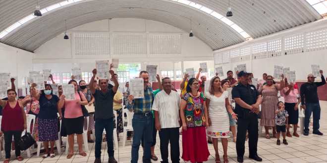 Correspondió a la titular de la Coordinación Estatal para la Regularización de la Tenencia de la Tierra (CERTT), Guadalupe Cruz Izquierdo y la secretaria del ayuntamiento Maribel Morales Cruz, hacer llegar la documentación, que les otorga certeza jurídica patrimonial a más vecinos de esa demarcación.