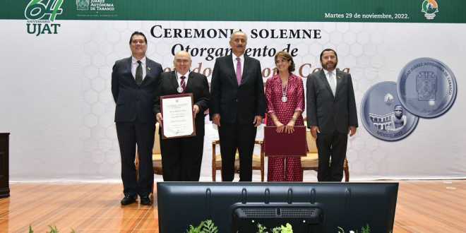 En su intervención y después de escuchar a los galardonados, el rector Narváez Osorio destacó que al otorgar un Doctorado Honoris Causa, la UJAT reconoce la trayectoria vital de personalidades con méritos excepcionales en la ciencia, el desarrollo tecnológico, las artes o en las humanidades, que han logrado crear una obra ejemplar para las futuras generaciones, y cuya labor constituye un ejemplo a seguir y un aporte significativo para el bienestar de la sociedad.