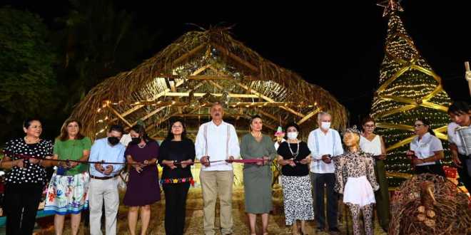 Acto seguido, las autoridades también inauguraron el nacimiento del Ayuntamiento de Centro, ubicado en la explanada de la Plaza de la Revolución, titulado “Regocijo de Paz”, que contiene como elemento principal una humilde choza donde se ha posado la estrella de Belén, la cual anuncia la buena nueva, rodeada de flores de nochebuenas y de coloridos animales domésticos, de traspatio y especies de la fauna local.