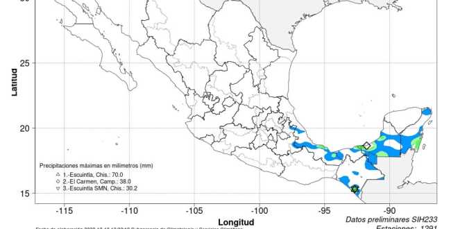 En contraste, por la tarde se pronostican temperaturas máximas de 35 a 40 grados Celsius en Chiapas, Colima, Guerrero, Jalisco, Michoacán, Nayarit y Oaxaca, y de 30 a 35 grados Celsius en Campeche, Nuevo León, Quintana Roo, San Luis Potosí, Sinaloa, Tabasco, Tamaulipas, Veracruz y Yucatán. Se prevén intervalos de chubascos (de 5 a 25 milímetros [mm]) en Chiapas, Campeche, Oaxaca, Quintana Roo, Tabasco y Veracruz, y lluvias aisladas (de 0.1 a 5 mm) en Coahuila, Colima, Guerrero, Jalisco, Michoacán, Nuevo León, Tamaulipas y Yucatán. Asimismo, se espera viento de componente sur con rachas de 40 a 60 kilómetros por hora (km/h) en Coahuila, Nuevo León y Tamaulipas, y vientos con rachas de 40 a 60 km/h en Chihuahua y Durango.