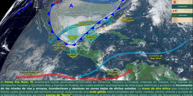 El Frente Frío Número 19 recorrerá el noreste, oriente y sureste de la República Mexicana, hasta la Península de Yucatán, propiciará lluvias torrenciales (de 150 a 250 milímetros [mm]) en regiones de Tabasco y Veracruz; intensas (de 75 a 150 mm) en áreas de Chiapas y Oaxaca; muy fuertes (de 50 a 75 mm) en sitios de Campeche, Quintana Roo y Yucatán, y fuertes (de 25 a 50 mm) en localidades de Puebla.