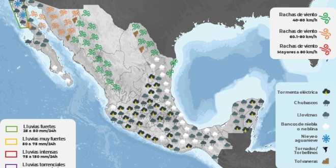 Asimismo, se pronostica viento con rachas de 50 a 60 kilómetros por hora (km/h) con tolvaneras en Chihuahua, Coahuila, Durango, Nuevo León y Tamaulipas. Durante la noche, la aproximación de un frente frío al noroeste de México, la corriente en chorro polar y una vaguada polar provocarán lluvias fuertes (de 25 a 50 mm) en Baja California; chubascos en Sonora; viento con rachas de 70 a 90 km/h en el norte del Golfo de California y rachas de la misma intensidad con tolvaneras en Baja California y Sonora.