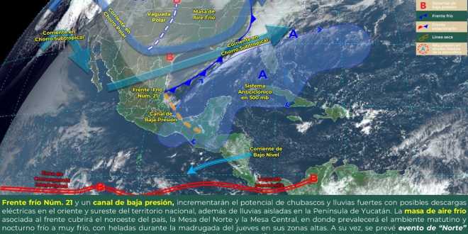 Las condiciones antes descritas serán originadas por el Frente Frío Número 21, que se extenderá desde el noreste del Golfo de México hasta el sur de Veracruz, adquiriendo características de estacionario durante la tarde, la masa de aire frío asociada a este sistema y el ingreso de aire húmedo proveniente del Océano Pacífico, Golfo de México y el Mar Caribe.