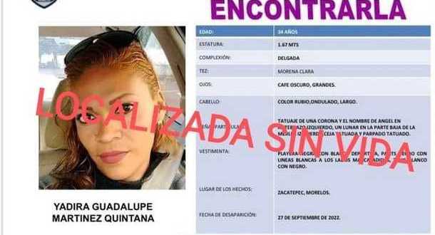 Yadira Guadalupe, de 34 años, fue reportada como desaparecida el pasado 27 de septiembre en el municipio de Zacatepec, en la zona cañera, considerada así por los nativos de la Región Sur de Morelos.