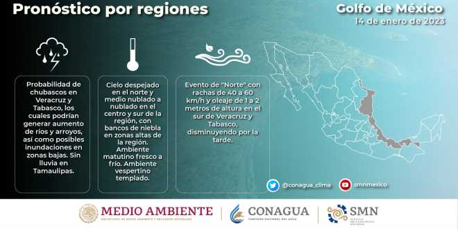 Se prevé cielo despejado en el norte de la región, de medio nublado a nublado en el centro y sur, evento de Norte con rachas de 40 a 60 km/h y oleaje de 1 a 2 m de altura en el sur de Veracruz y Tabasco, condición que disminuirá por la tarde. El pronóstico para la Península de Yucatán es de ambiente matutino de fresco a templado, con bancos de niebla y ambiente cálido hacia la tarde.