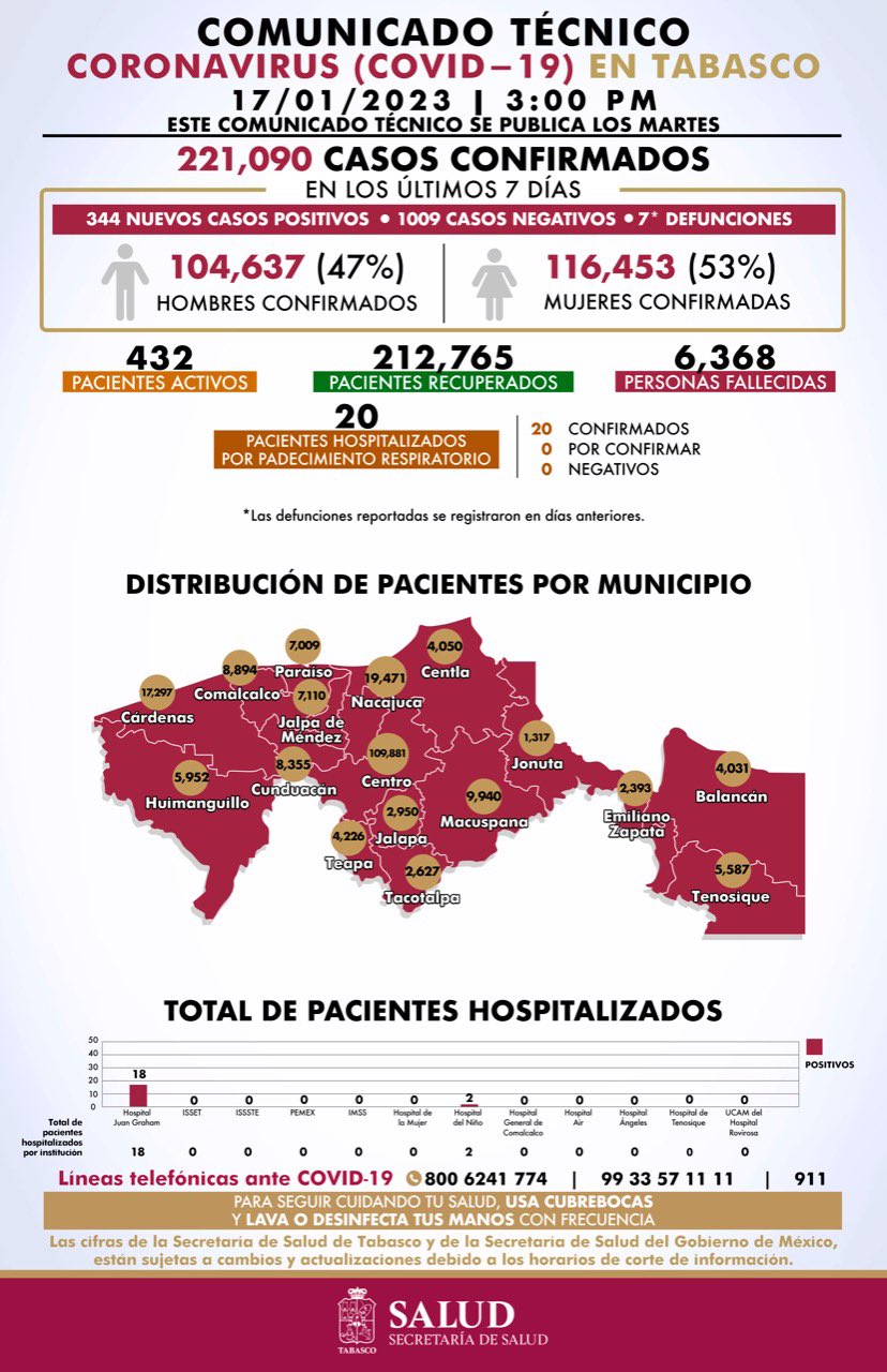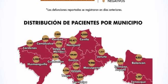 El comunicado técnico indica que Centro es el municipio con el mayor número de casos confirmados, con 109 mil 881, y le siguen Nacajuca, con 19 mil 471; Cárdenas, 17 mil 297; Macuspana, 9 mil 940; Comalcalco, 8 mil 894; Cunduacán, 8 mil 355; y Jalpa de Méndez, con 7 mil 110.