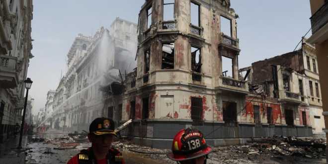 El trabajo está centrado en apagar los rescoldos del incendio que arrasó el edificio, construido en buena medida con madera y quincha, y que se está derrumbando poco a poco.