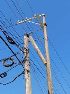 A punto de caer se encuentra este poste de energía eléctrico.