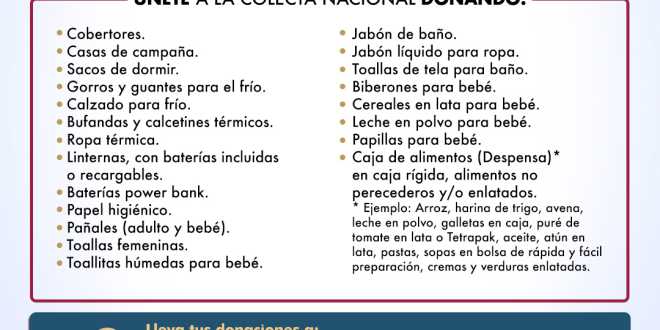 Precisó que estas acciones se realizan en conjunto con la Coordinación Nacional de Protección Civil (CNPC), quienes recomendaron la donación de cobertores, casas de campaña, sacos de dormir, gorros y guantes para el frío, bufandas y calcetines térmicos, ropa térmica, linternas, con baterías incluidas o recargables, baterías Power Bank, papel higiénico, pañales (adulto y bebé), toallas femeninas.