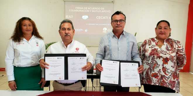 Con la firma de colaboración realizada entre el Instituto de Educación para Adultos de Tabasco (IEAT) y el Centro de Capacitación para el Trabajo Industrial (CECATI) número 44 del municipio de Cárdenas, se fortalecen los conocimientos y habilidades de las personas de 15 años y más que concluyen algún nivel de su educación básica en busca de crear mejores oportunidades de desarrollo.
