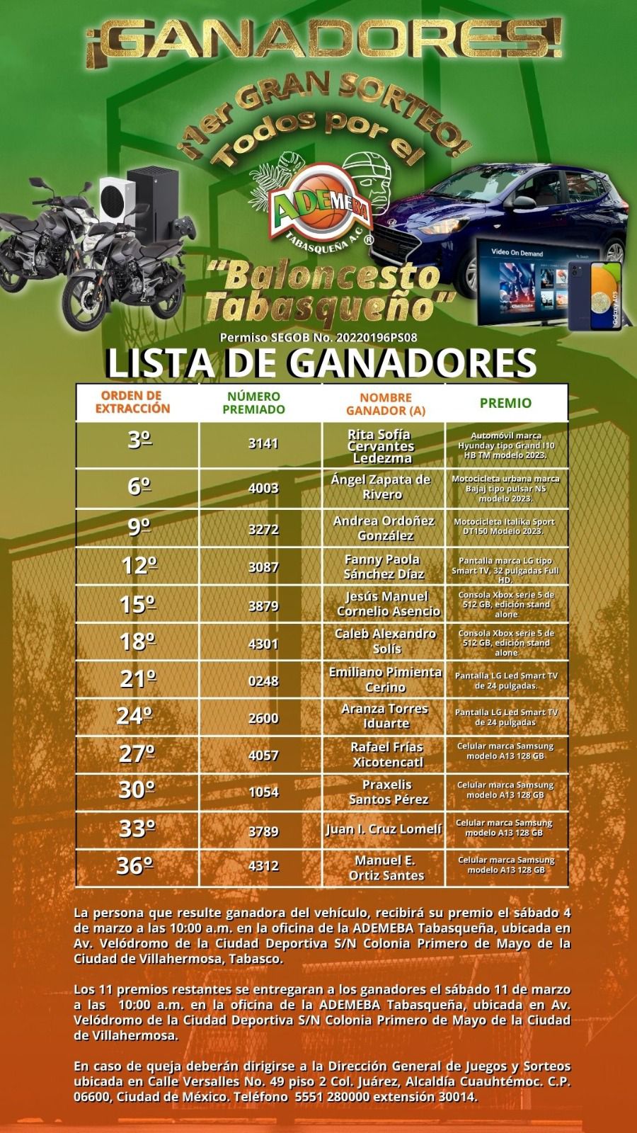 Los ganadores de este 1er. Gran Sorteo Todos por el Baloncesto Tabasqueño se designaron a través de la extracción de 36 talones, uno a uno, otorgando los premios cada tercer boleto extraído de la tómbola giratoria, por lo que el premio de mayor valor se dio al tercer boleto extraído, el segundo premio al 6° boleto extraído, el tercer lugar al 9° boleto y así de manera descendente hasta concluir con la designación de los 12 premios contemplados para la realización de este sorteo.
