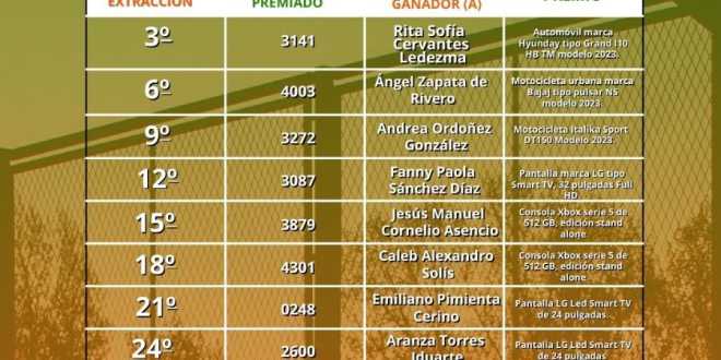 Orden de extracción Número premiado Nombre ganador (a) Premio
