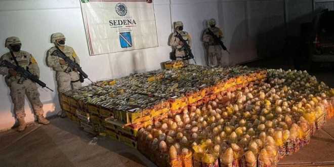 Derivado de lo anterior y de la planeación operativa, integrantes del Ejército Mexicano intensificaron patrullajes de vigilancia en citado poblado, observando a dos individuos en el exterior de una construcción en obra negra, mismos que al notar la presencia de los militares emprendieron la huida, dejando abandonados diversos contenedores, bolsas y hieleras; por consiguiente, se implementó un dispositivo de seguridad y se realizó una revisión minuciosa a lo localizado, asegurando lo siguiente: