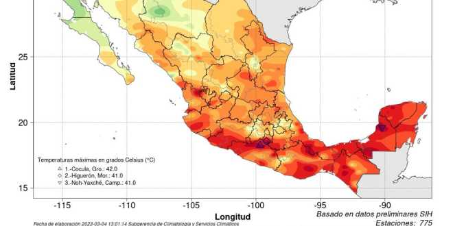 Hoy, un sistema de alta presión –anticiclón— situado en niveles medios de la atmósfera, mantendrá ambiente vespertino caluroso a muy caluroso en la Península de Yucatán, y en el occidente, centro y sur de la República Mexicana; se pronostican temperaturas máximas de 40 a 45 grados Celsius en Guerrero y Morelos; de 35 a 40 grados Celsius en Campeche, Chiapas, Colima, Jalisco, Michoacán, Nayarit, Oaxaca, Quintana Roo, Tabasco, Veracruz y Yucatán, y de 30 a 35 grados Celsius en el suroeste del Estado de México, Guanajuato, Hidalgo, Nuevo León, Puebla, Querétaro, San Luis Potosí, Sinaloa, sur de Sonora y Tamaulipas.