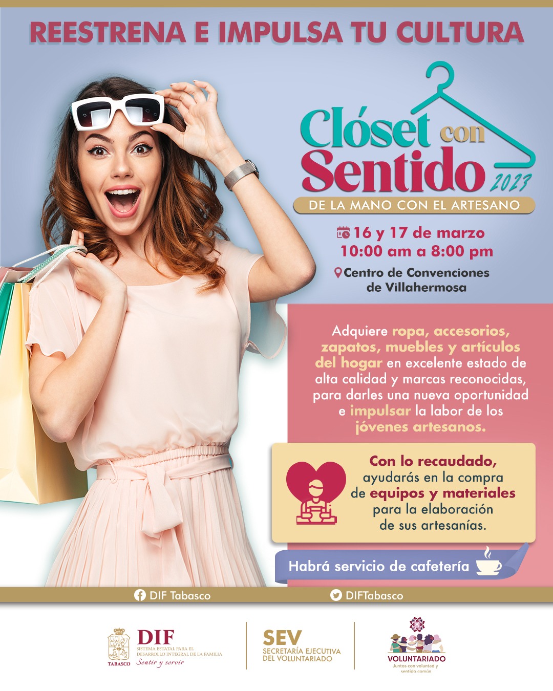 El Sistema DIF Tabasco invitó a los tabasqueños a sumarse al evento “Clóset con Sentido 2023, de la mano con el artesano», que se desarrollará los días 16 y 17 de marzo en el Centro de Convenciones Tabasco 2000, el cual busca recaudar fondos para la compra de equipos y materiales para fortalecer la labor de los jóvenes artesanos tabasqueños.