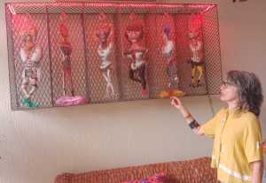 En la sala de su casa tiene una gran obra llamada “Trata”; consiste en una estructura estilo jaula que tiene una serie de divisiones y dentro de cada una de ellas hay muñecas que representan mujeres de diferentes etnias y edades.