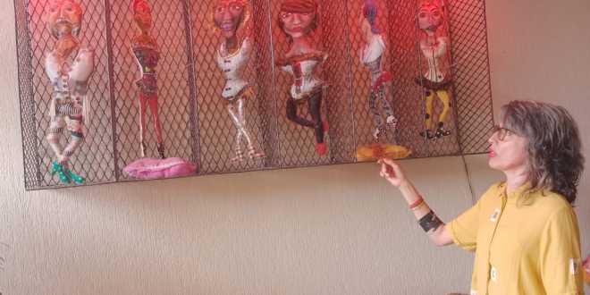 “Las mujeres no tienen brazos, pero traen una especie de corset; están enjauladas y colgadas como si fueran títeres, porque en realidad las están tratando como títeres”, refirió la artista.