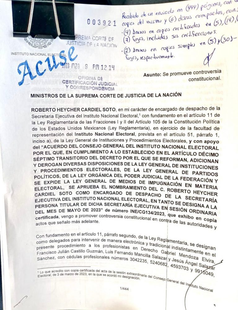 El Instituto Nacional Electoral (INE) presentó ante la Suprema Corte de Justicia de la Nación (SCJN) una segunda demanda de Controversia Constitucional en contra del Decreto por el que se reforman la Ley General de Instituciones y Procedimientos Electorales, la Ley General de Partidos Políticos, la Ley Orgánica del Poder Judicial de la Federación y la expedición de la Ley General de los Medios de Impugnación en Materia Electoral publicadas en el Diario Oficial de la Federación el pasado 2 de marzo de 2022.