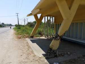 En recorrido realizado por una parada de camiones en la zona del fraccionamiento ‘Las Rosas’, se pudo constatar que está a punto de colapsar debido que hace un tiempo un automóvil chocó contra ella y no ha sido reparada.