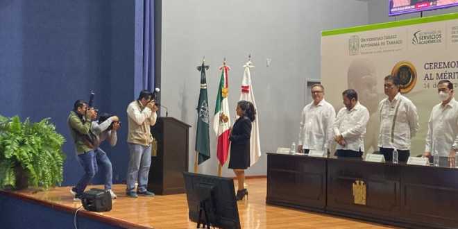En representación de los galardonados con el Mérito Académico, la maestra Lily Pérez López de la División Académica de Ciencias Económico Administrativas, agradeció al rector Guillermo Narváez Osorio, por realizar la modificación a los requisitos de la convocatoria, para que los docentes que participaron pudieran ser evaluados con base en sus actividades frente a grupo, lo que le permitió ser distinguida con este reconocimiento.