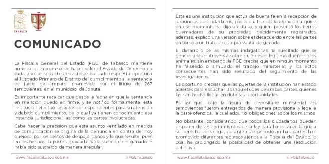 La Fiscalía General del Estado (FGE) de Tabasco mantiene firme su compromiso de hacer valer el Estado de Derecho en cada uno de sus actos; es así que ha dado respuesta oportuna al Juzgado Primero de Distrito del cumplimiento a la sentencia de juicio de amparo, promovido por el litigio de 267 semovientes, en el municipio de Jonuta.