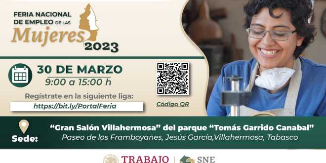 A fin de promover oportunidades laborales a los buscadores de empleo en Tabasco, la Secretaría de Gobierno del estado a través del Servicio Nacional de Empleo Tabasco en coordinación con la Secretaría de Trabajo y Previsión Social del Gobierno de México, y el Ayuntamiento de Centro, llevarán a cabo el próximo jueves 30 de marzo, la Feria Nacional de Empleo para la Inclusión Laboral de las Mujeres 2023.