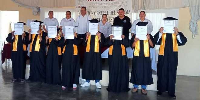 El titular del IEAT, Raúl Ochoa Bolón y el director del Cereso, Rubicel Castillo Gómez, encabezaron la entrega de 2 certificados de primaria y 6 de secundaria a igual número de personas que decidieron aprovechar el servicio gratuito que brinda la institución educativa de forma equitativa e igualitaria a toda persona de 15 años y más que requiera cursar su alfabetización y educación básica.