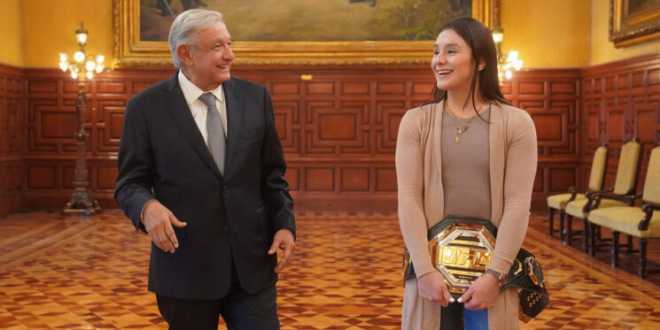“Por joven, mujer y deportista es un orgullo de México”, afirmó el presidente Andrés Manuel López Obrador al reunirse con Alexa Grasso, campeona mundial de la UFC en artes marciales mixtas.