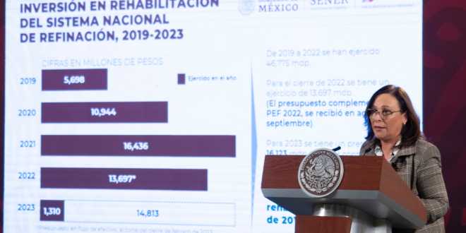 Aunado a lo anterior, la encargada de la política energética del país recordó que la Refinería Olmeca en Dos Bocas que va a procesar 340 mil barriles por día, de los cuales se van a obtener 170 mil barriles de gasolina y 120 mil barriles de diésel ultra bajo azufre por día; concluyó su etapa constructiva el 1 de julio de 2022, con un costo total del proyecto de 12.600 millones de dólares y actualmente ya se encuentra en proceso de pruebas, arranque e integración de líneas.