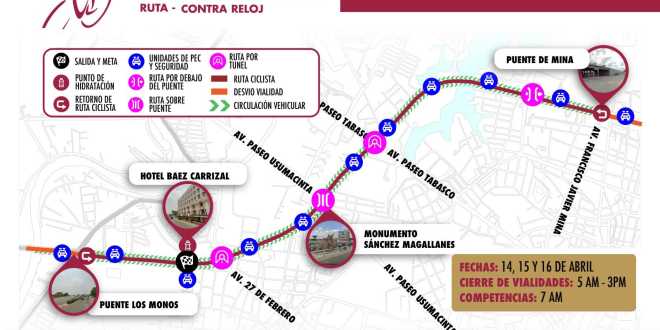 El Instituto de la Juventud y el Deporte de Tabasco, en coordinación con la Secretaría de Seguridad y Protección Ciudadana, la Policía Estatal de Caminos y el Instituto de Protección Civil de Centro, informan a la ciudadanía sobre la ruta ciclista donde se estarán realizando las competencias del Macro Regional de Ciclismo en las pruebas de ruta y contrarreloj.
