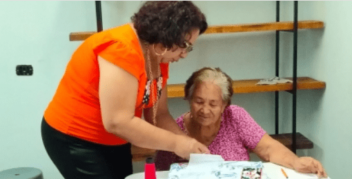La señora Amparo Marín Cabrera, de 82 años de edad, dijo estar muy contenta de asistir a esta clase, por lo cual se encuentra motivada de aprender a bordar la tira bordada, que tanto le gusta.