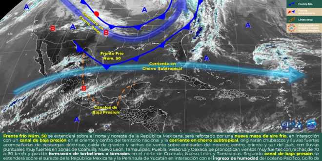 El Frente Frío Número 50 que se extenderá desde el noreste del Golfo de México hasta el norte del país en interacción con un canal de baja presión sobre el oriente del territorio nacional, canales de baja presión en el centro y sureste mexicano, y el ingreso de humedad de ambos océanos, son los sistemas meteorológicos que ocasionarán las condiciones antes descritas. En lo referente a temperaturas, se esperan valores mínimos de -5 a 0 grados con heladas en montañas de Chihuahua y Durango, y de 0 a 5 grados Celsius con posibles heladas en sitios altos de Baja California y Estado de México.