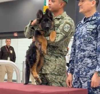 El cachorro pastor alemán que donó el Gobierno de Turquía a México en honor y gratitud a Proteo, el binomio canino de la Secretaría de la Defensa Nacional (Sedena) que falleció en cumplimiento del deber en aquel país, ya está en México.