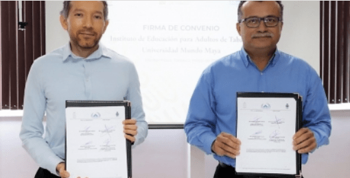 Con la firma de convenio de colaboración entre el Instituto de Educación para Adultos de Tabasco (IEAT) y la Universidad Mundo Maya, los alumnos de ésta podrán realizar su servicio social o práctica profesional como asesores educativos de las personas educandas que cursan sus estudios de alfabetización, primaria y secundaria.