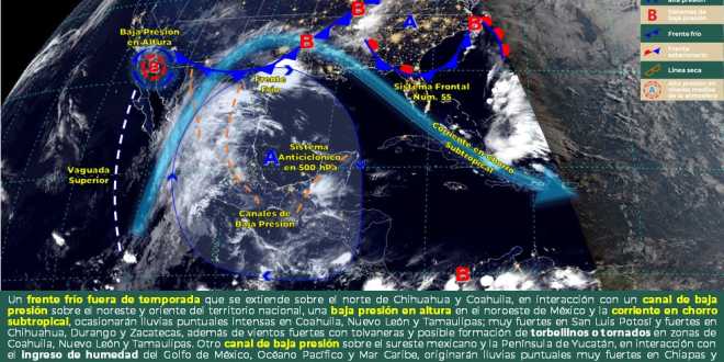 Las condiciones meteorológicas serán originadas por un frente frío fuera de temporada, que se extenderá sobre el norte de Chihuahua y Coahuila, en interacción con un canal de baja presión sobre el noreste y oriente del territorio nacional; una baja presión en altura en el noroeste de la República Mexicana; la corriente en chorro subtropical y por un canal de baja presión sobre el sureste mexicano y la Península de Yucatán, en combinación con el ingreso de humedad del Golfo de México, Océano Pacífico y Mar Caribe.