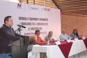 Como parte de la política de buen gobierno y mejora de la gestión pública para servir al pueblo y garantizar la accesibilidad a servicios públicos de calidad; por instrucciones de nuestro Gobernador Carlos Manuel Merino Campos, este medio día el Secretario de Gobierno, Guillermo Arturo del Rivero Leon, realizó la entrega de equipamiento informático y mobiliario para la modernización de las oficialías del Registro Civil del Ayuntamiento de Nacajuca.