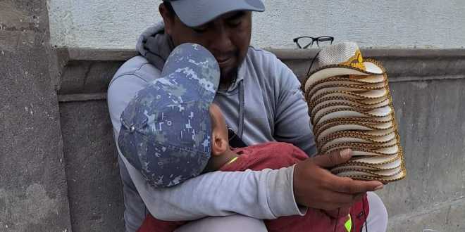 Alfonso vende estos artículos elaborados de forma artesanal, pero en sus brazos tiene a su hijo Tadeo de tan solo 5 años.