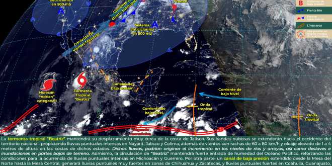 En las próximas horas, la tormenta tropical Beatriz ocasionará lluvias intensas (de 75 a 150 milímetros [mm]) en Colima, Jalisco y Nayarit; muy fuertes (de 50 a 75 mm) en Guerrero y Michoacán; viento con rachas de 60 a 80 kilómetros por hora (km/h) y oleaje de 1 a 4 metros (m) de altura en las cosas de los estados mencionados. A las 09:00 horas, tiempo del centro de México, el centro de Beatriz se localizó aproximadamente a 20 kilómetros (km) al oeste de Cabo Corrientes, Jalisco, y a 120 km al noroeste de Playa Pérula, Jalisco.