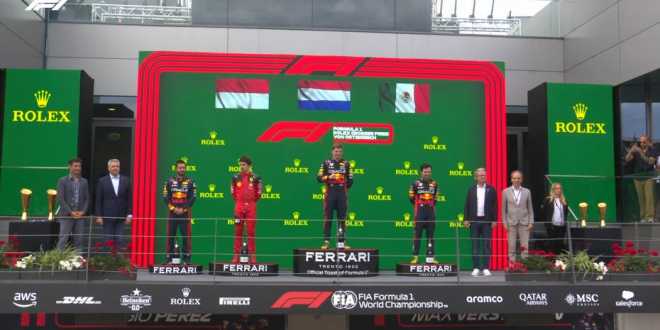 El bravo piloto tapatío se repone de una salida desde los límites de la parrilla, para remontar hasta el podio de triunfadores y se coloca en tercer lugar, atrás de su compañero de equipo Max Verstappen y Charles Leclerc.