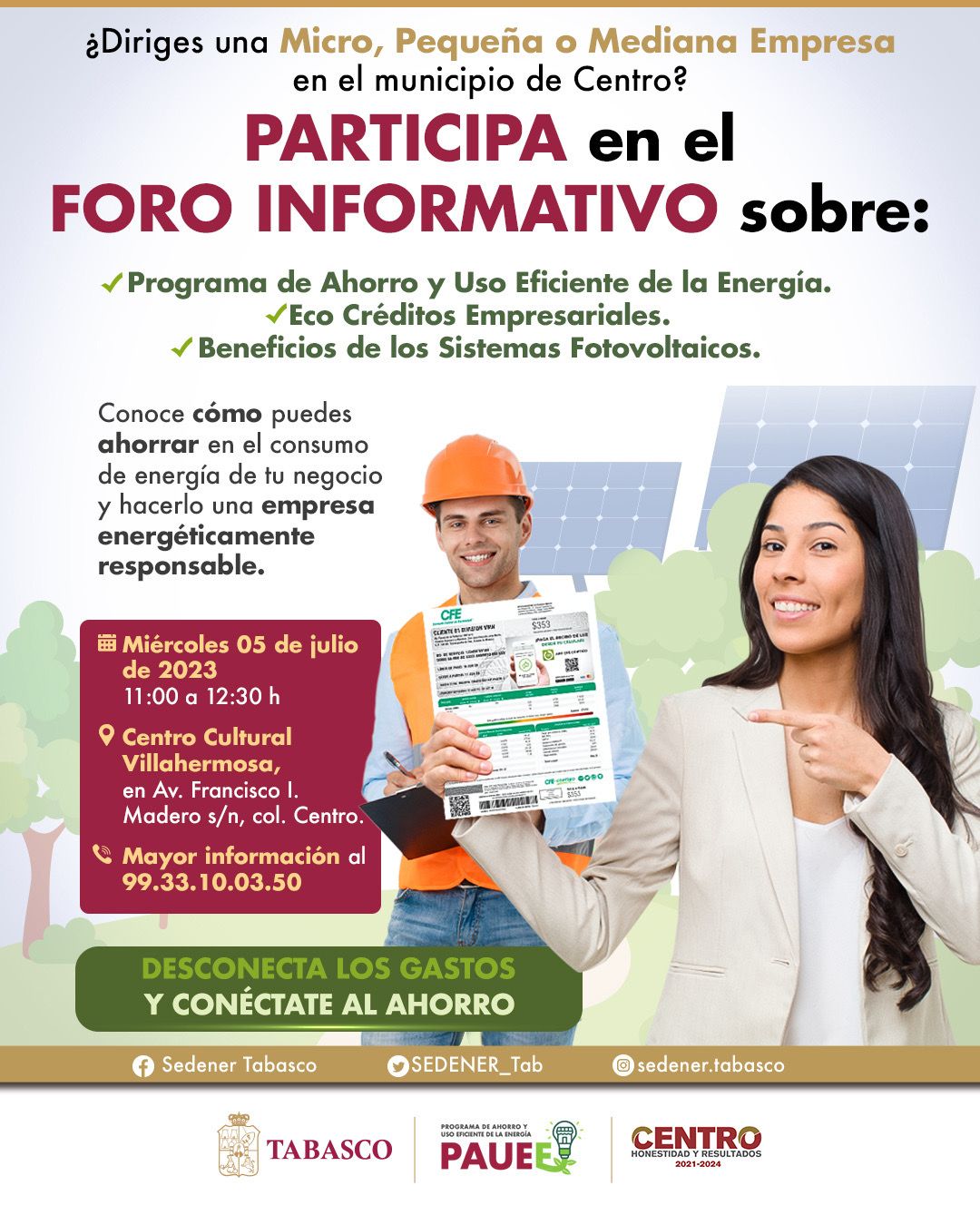 La Secretaría para el Desarrollo Energético (Sedener) invita a empresarios del municipio de Centro a acudir al foro informativo sobre el Programa de Ahorro y Uso Eficiente de la Energía (PAUEE), que se realizará el próximo miércoles 5 de julio a las 11:00 horas, en el Centro Cultural Villahermosa, ubicado en la avenida Francisco I. Madero.