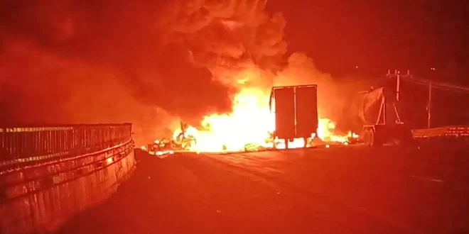 Primeros informes refieren que 10 tráileres chocaron, uno detrás de otro, lo que derivó en el incendio de las unidades.