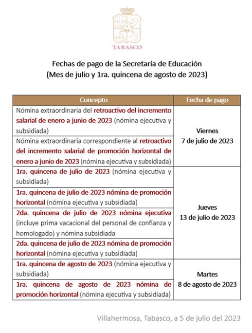 El jueves 13 de julio se pagarán la primera quincena de julio de 2023 (nómina ejecutiva y subsidiada); primera quincena de julio 2023 de nómina de promoción horizontal (nómina ejecutiva y subsidiada); segunda quincena de julio de 2023 de nómina ejecutiva (incluye prima vacacional del personal de confianza y homologado) y nómina subsidiada; y segunda quincena de julio de 2023 nómina de promoción horizontal (nómina ejecutiva y subsidiada).