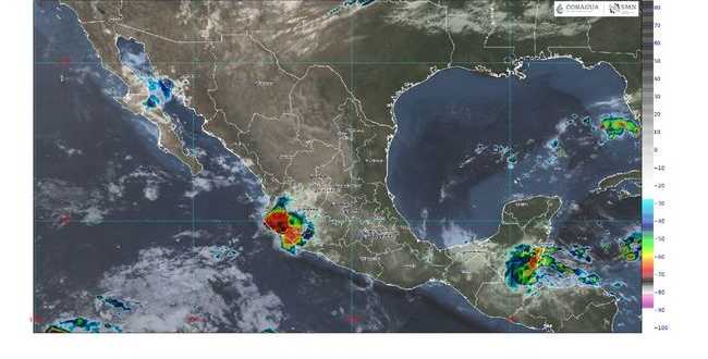 Para hoy, jueves, se pronostican lluvias puntuales intensas (de 75 a 150 milímetros [mm]) en Chiapas, Oaxaca, Tabasco y el sur de Veracruz; muy fuertes (de 50 a 75 mm) en Campeche, Colima, Guerrero, Jalisco, Michoacán, Sonora y Yucatán; fuertes (de 25 a 50 mm) en Chihuahua, Durango, Nayarit, Quintana Roo y Sinaloa; intervalos de chubascos (de 5 a 25 mm) en Baja California, Baja California Sur, Ciudad de México, Estado de México, Guanajuato, Hidalgo, Morelos, Puebla y Tlaxcala, así como lluvias aisladas (de 0.1 a 5 mm) en Coahuila, Nuevo León, Querétaro, San Luis Potosí, Tamaulipas y Zacatecas.