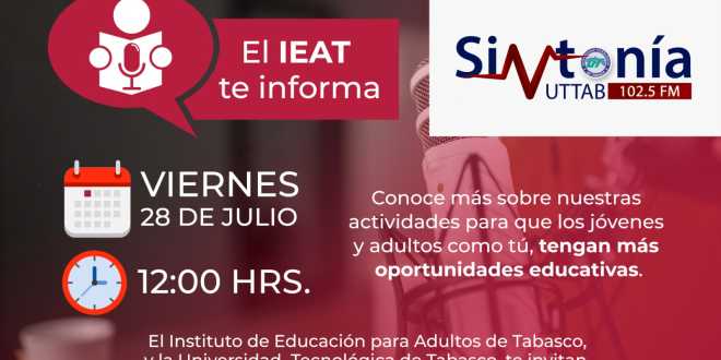 Las actividades más relevantes en cuanto a educación básica para jóvenes y adultos, entrevistas, recomendaciones de lecturas y testimonios de los beneficiarios, así como de quienes hacen posible el servicio educativo en cada rincón del estado, podrán ser escuchados en el programa “El IEAT Informa” a partir de este viernes 28 de julio en punto de las 12:00 del día a través de la frecuencia de Sintonía UTTAB 102.5 FM.