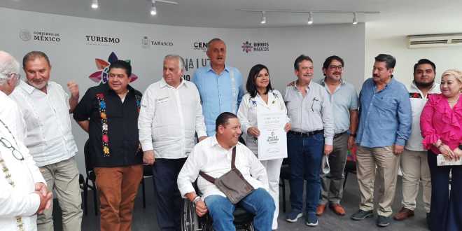 El secretario de turismo, Miguel Torruco Márquez entrega el distintivo a las autoridades del municipio en un acto protocolario en el Lobby del Centro Cultural Villahermosa, donde estuvo acompañado del gobernador del estado Carlos Manuel Campos Merino, el secretario de turismo del estado, José Antonio Nieves, la alcaldesa de Centro, ing. Alejandro Zuñiga, director de Angeles Verdes y lic. Daniel Castillo, representante legal de corazón urbano.