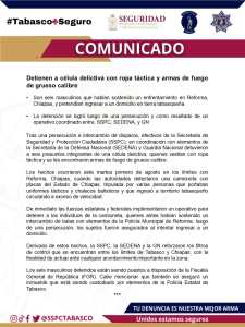 Los seis masculinos detenidos están siendo puestos a disposición de la Fiscalía General de República (FGR). Cabe mencionar que también se aseguró un inmueble que está siendo custodiado por elementos de la Policía Estatal de Tabasco.